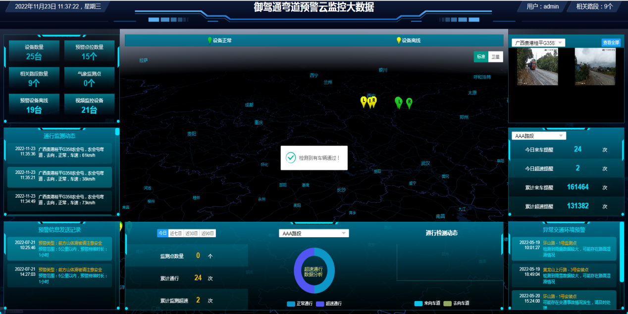 行车安全智慧化预警系统采用物联网、、、、云计算、、、、人工智能、、、大数据等技术,,,,在弯道入弯处安装智慧化弯道预警系统,,,,通过雷达微波检测车辆采集技术,,,实时获取过往车辆速度和行驶数据,,发送到对向车道入弯处的弯道智能预警系统的显示屏上。。通过预警屏和语音喊话,,,驾驶员在进入弯道前就能了解到前方对向车道的车辆行驶信息,,对驾驶员有警示和提示的作用。。。同时系统还具备远程监控、、、、超速预警抓拍、、、气象分析、、、气象监测、、、事故分析、、、、地质灾害预警、、、云平台统一管理等功能。。。。